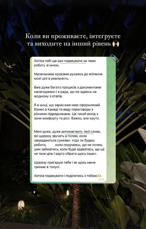 Пройшла особисту непросту трансформацію на рівні тіла і душі, стосунків, роду та фінансів. Зараз допомагаю пройти цей шлях іншим